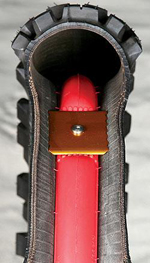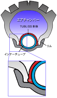 TUBLISSは本体とインナーチューブから構成されており、インナーチューブで本体を押し広げてタイヤ内面に押しつけることでエアチャンバーを形成します。これがチューブレス化の仕組みです。このようにビードがリムに押しつけられているためにエアチャンバー内が低圧でもビードが落ちないのです。 |