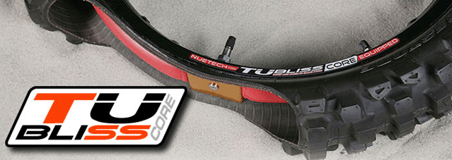 TUBLISSは本体とインナーチューブから構成されており、インナーチューブで本体を押し広げてタイヤ内面に押しつけることでエアチャンバーを形成します。これがチューブレス化の仕組みです。このようにビードがリムに押しつけられているためにエアチャンバー内が低圧でもビードが落ちないのです。 |