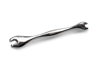オフロードモデルのほとんどが採用するスポークタイプのホイールは衝撃の吸収性に長けているのですが、緩みが生じると致命的なトラブルになる場合がありますので定期的な点検が必要です。 そんな時に素早く、しかもしっかりと締めることが出来る工具です。 ◆何が良いの? 片側が普通のニップルレンチ、もう片側が力の掛かり易い3サイドオープンレンチになっています。 素早く締める時は通常の形状の方で、しっかりトルクを掛ける時は3サイドオープンの方で行う事でしっかりと締める事が出来ます。
